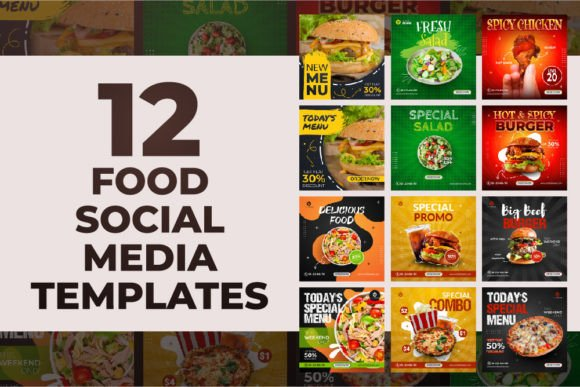There are 12 food social media templates suitable for product promotion on Instagram, Facebook, Twitter, and marketing ads on social media.